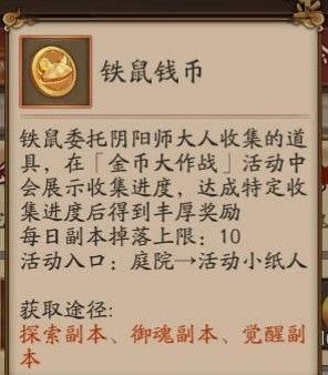 铁鼠钱币是游戏中的一个活动道具,玩家要通过完成任务才能得到,除此之外还可以参与每日探索、觉醒、御魂等,参与副本挑战就可以得到最高掉落的10个铁鼠钱币。参与活动能获得非常多的奖励,每个活动任务都能得到海量的金币,普通的一个活动任务就能获得10万金币,如果是遇到了一些特殊的任务,奖励就会翻倍,不过金币和钱币是不一样的。