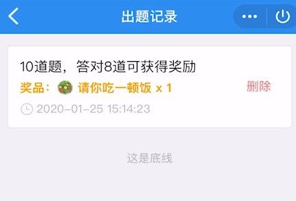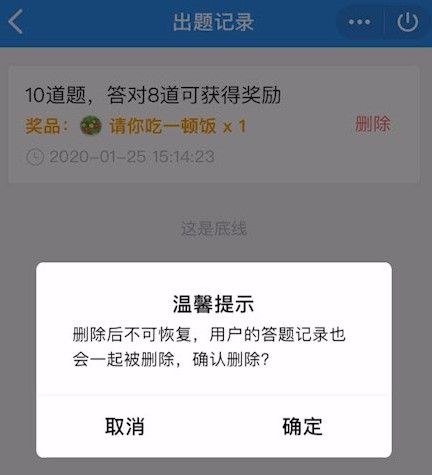 删除默契问答的方法非常简单,在手机qq里面直接输入默契问答,会弹出相对应的小程序,进入小程序后,在界面上有一个出题记录,直接点击出题的进度,里面全是你提问过的一些问题,点击问题的右边,这里有一个删除键,按下这个删除会有一个温馨提醒,直接点击确定删除掉即可。