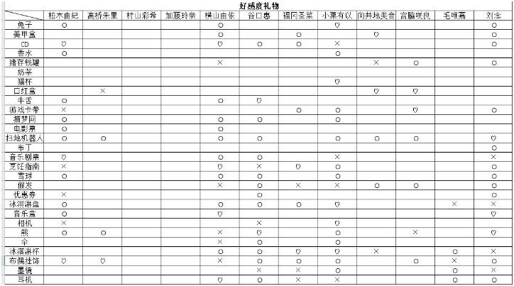 提升好感度最直接的方法就是送礼物,但是你要送对方喜欢的东西才可以,如果送的东西不对,好感度不会增加反而会下降哦。不同偶像的喜好和讨厌的东西,小编都用下面的这个表格来为大家分析,画圆圈圈的是代表一般喜欢,画叉叉是代表讨厌,爱心是代表最喜欢的。