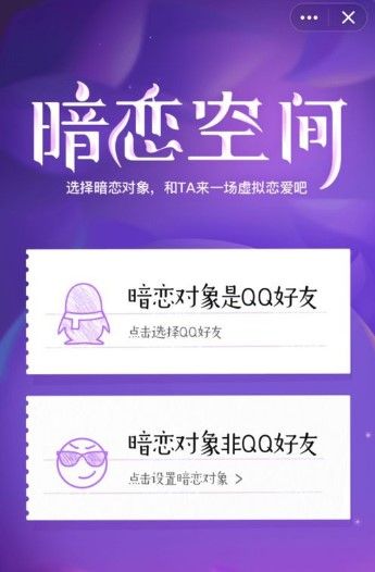 在手机qq的首页上方会有一个搜索栏,大家直接点击这个搜索栏,搜索暗恋空间这四个字,就能弹出相对应的小程序,小程序的图标是紫色背景加上一个爱心的图形,非常好辨认。进入暗恋空间的操作界面之后,会显示两个不同的选项,分别是暗恋对象是QQ好友以及暗恋对象非qq好友,根据个人的情况来选择。