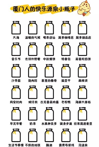 把喜好、情绪罗列出来,瓶子的状态就是事物喜好的程度,快乐多一点,填色多一点,你看多么朴实无华又...无聊,那既然无聊,那我们继续无聊叭,还衍生出了各种版本:爱豆小瓶子、心动小瓶子、暴躁小瓶子……涂涂抹抹又是一个美妙的下午,包括各个地区的特色美食等,从四川到厦门,应有尽有。