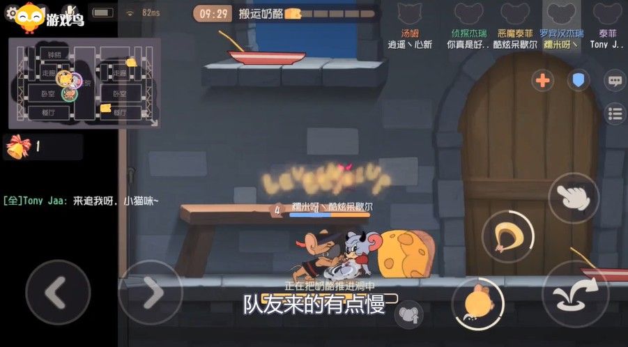 猫和老鼠手游这个泰菲好嚣张啊,开始就吸引了一波仇恨,我最喜欢这样的队友了,让猫盯上他我们也能安心推奶酪,侦察阶段泰菲开始疯狂打信号,但是汤姆直接无视他了,这个恶魔身法也挺好的,被汤姆追了那么久也没被打爆。出洞后来盔甲房推奶酪,这个沙袋就很烦了,打掉了我的护佑,队友来的有点慢,我和恶菲直接推掉了奶酪,然后到右边古堡继续推奶酪,这个泰菲还在疯狂打信号,我说你又不运奶酪又不推奶酪,猫怎么知道你在哪?