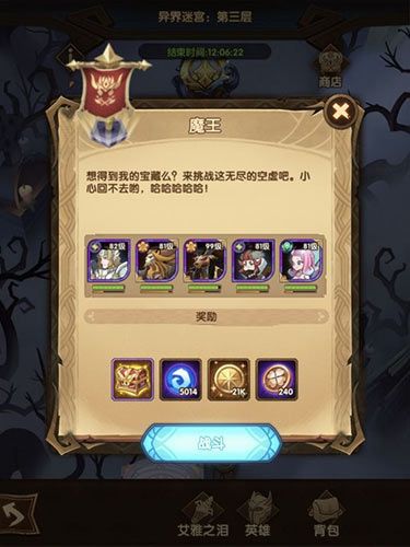 异界迷宫:每两天开放一次, 异界迷宫一共三层,第三层会有困难模式,通过每一层最后一关后可以获得迷宫币、钻石、各类资源等奖励。
