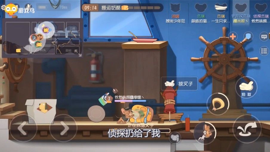 在厨房旁边终于发现最后一块蛋糕,杰瑞强枪直接被爆了,这种情况已经不知道遇到多少次了,我和侦探来船长室推奶酪,搬奶酪时看到一瓶随机药水,但是没拿到,没想到推奶酪时侦探扔给了我,这我肯定是不会要的,先把沙滩奶酪运过来然后把甲板的奶酪推掉,应该会在刷一个(奶酪),这个杰瑞绝对是不看小地图的,电影已经刷新一块奶酪了,他还往电影院运,然后还想抢我的隐身药水,有隐身可以先去救队友了,然后直接踩了老鼠夹,还好侦探来扔了个冰块,要不我就没了。
