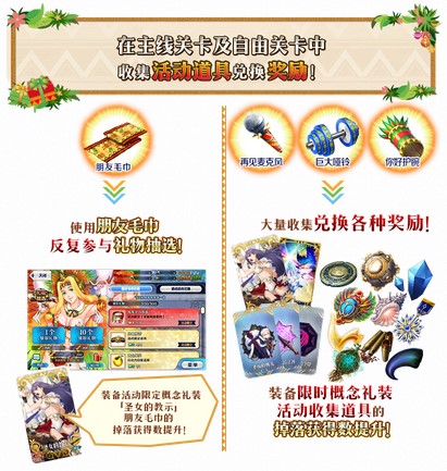 限时概念礼装「★5(SSR)小恶魔之雪」、「★4(SR)摇响银铃」、「★3(R)燃烧的直播解说席」也将登场。装备以上3种概念礼装,即可提升限时活动中道具的掉落获得数!