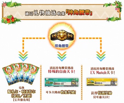 抽选时还有机会获得「摔角腰带」,使用此道具可以令活动限定从者宝具获得强化!开放可获得「呼符」等稀有奖励的特殊自由关卡与EX Match关卡,也同样需要消耗不同数量的「摔角腰带」。