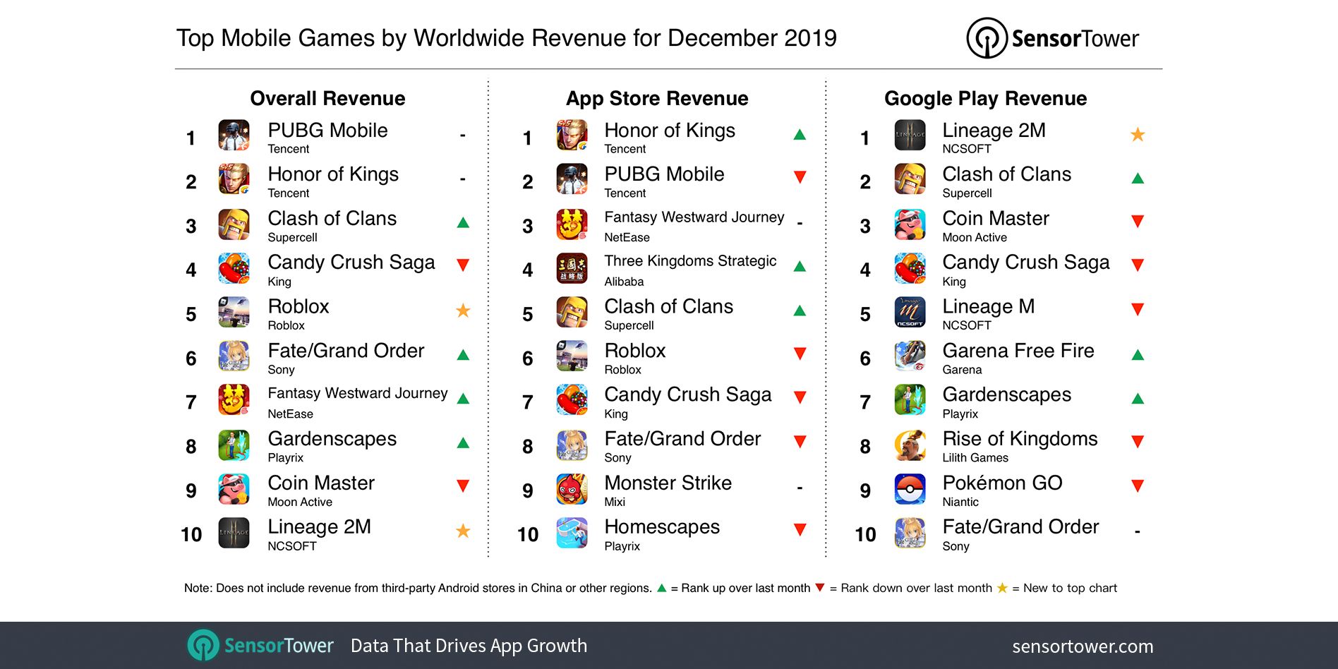 2019年12月中国手游发行商全球收入排行:腾讯、网易、莉莉丝位列前三