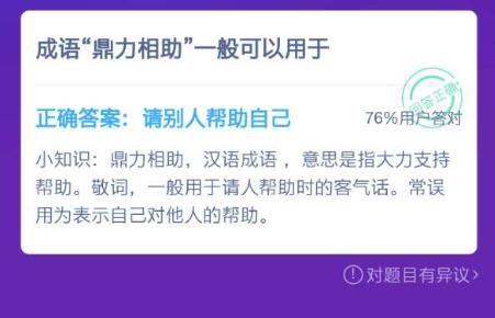 鼎力相助一般可用于?最新一起的蚂蚁小课堂又更新了,也是关于成语的问题,对成语知识比较了解的小伙伴,早早的答对了问题,并且领取了饲料,但是还有部分小伙伴,不知道问题的答案,或者直接就回答错误了,错失了好多饲料。不清楚问题答案的小伙伴,可以跟着小编一起往下看看哦!
