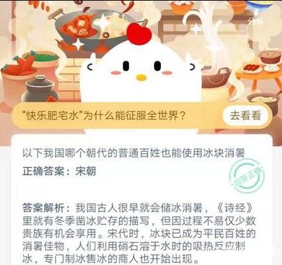 答案解析:我国古人很早就会储冰消暑,《诗经》 里就有冬季凿冰贮存的描写,但因过程不易仅少数贵族有机会享用。宋代时,冰块已成为平民百姓的消暑佳物,人们利用硝石溶于水时的吸热反应制冰,专门制冰售冰的商人也开始出现。