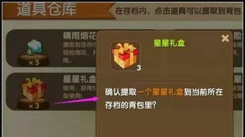 星星礼盒取出方法:打开背包,点击左下角的仓库,打开仓库在点击星星礼盒,点击提取,这样就可以把星星礼盒取出来放在背包里了。