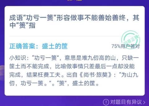 蚂蚁庄园功亏一篑什么意思?功亏一篑这个成语大家都理解其中的意思,但是具体是形容做事不能善始善终其中篑指什么?这里所想要知道的答案大家就不是特别理解了,不清楚答案如何选择可以看下面的攻略了解。