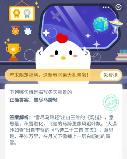 蚂蚁庄园大漠沙如雪,雪尽马蹄轻哪个描写了雪景?具体描写了冬天雪景的什么?12月31日有这样一道题,想要大家了解一下描写冬天雪景的诗句,提供了两个选项,分别是大漠沙如雪和雪尽马蹄轻,具体的答案选择下面有分享。