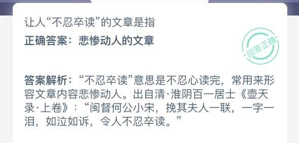 答案解析:“不忍卒读”意思是不忍心读完,常用来形容文章内容悲惨动人。出资清·淮阴百一居士《壶填录·上卷》:“闽督何公小宋,挽其夫人一联,一字一泪,如泣如诉,令人不忍卒读。”