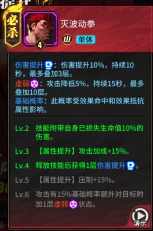 提升伤害,降低敌人攻击,附带损失生命值百分比伤害。可以作为连招的起手技能。