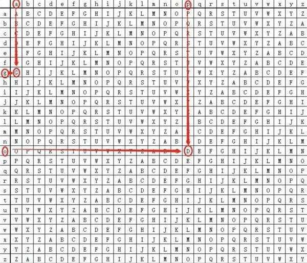 第一个字母a,密钥是g,从第一行找到字母a,从左侧的第一列找到g表格内由a和g相交的字母为G。