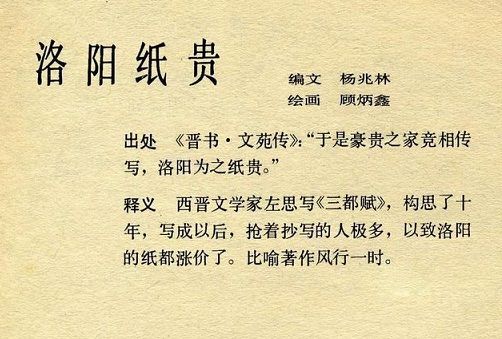 出自《晋书·文苑·左思传》:“于是豪贵之家竞相传写,洛阳为之纸贵。”比喻作品有价值,广为流传。洛阳纸贵,我国古代成语,原指洛阳之纸,一时求多于供,货缺而贵。比喻文章写得好,风行一时。在西晋太康年间出了位很有名的文学家叫左思,他曾做一首《三都赋》在京城洛阳广为流传。为写《三都赋》,他闭门谢客,开始苦写。经过十年,这篇凝结着左思甘苦心血的《三都赋》终于写成了!在名人作序推荐下,《三都赋》很快风靡了京都,懂得文学之人无一不对它称赞不已。同是一篇文章,有人将它贬得一钱不值,有人使之名噪一时。这其中当然有鉴别力高低的区别,可是更重要的是反映了人们是否重视新生力量,能不能慧眼识英才的问题。