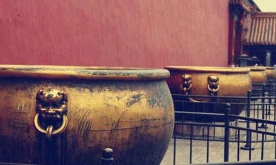 3、在宫殿前设置的这些大水缸,称之为门海、吉祥缸、太平缸,每尊可贮水 3000 多升,过去由几十个太监专门负责管理,每天派劳役从井内吊水,把缸打满。