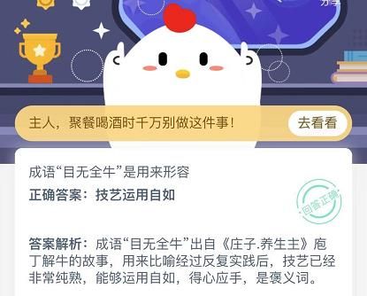 蚂蚁庄园12月27日出的题目有两道第一道是冬天用舌头舔铁栏杆被粘住可以怎么化解?第二道题目是成语目无全牛是用来形容?大家都会随机获得其中的一道题目。这两道题目的答案跟答案解析,小编已经全部都为大家准备好了,快来看看吧!