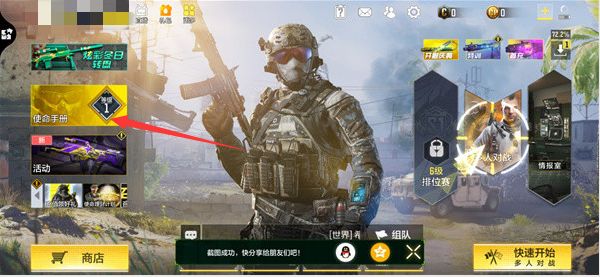 1、登陆使命召唤手游中,在手游大厅中找到使命手册,然后点击进入到使命手册等级页面。