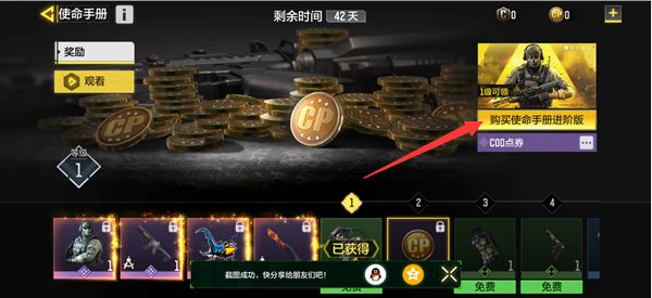 2、在使命手册页面的右上角找到购买使命手册进阶版,点击进去之后就可以直接购买了。