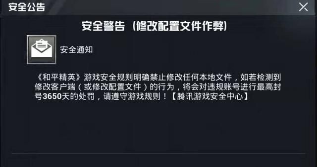 《和平精英》游戏安全规则明确禁止修改任何本地文件,如若检测到修改客户端(或修改配置文件)的行为, 将会对违规账号进行最高封号3650天的处罚,请遵守游戏规则! [ 腾讯游戏安全中心]