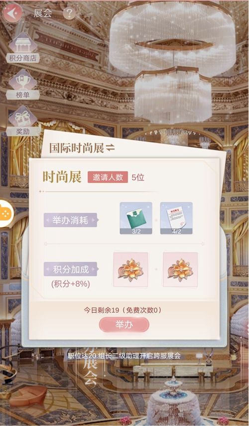 如果气场够强,想要更高档次平台,可使用“国际邀请函+国际展会邀请函”举办豪华【国际展会】,最多可邀请25个玩家参展,并获得更多的展会积分。每次举办展会最多可选择佩带珠宝,可增加展会积分加成,在国际会展中展示当前最高级的珠宝,加成的积分便可MAX!展会积分每日排行前100名将计入排行榜,并获得额外展会积分奖励,积分可用于兑换钻石等好礼。克拉酱相信你一定能拔得头筹~