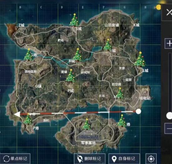 海岛地图上圣诞树的刷新地点如下图所示,一共有10处刷新点,圣诞树分别会刷新在S城、G港、L城、废墟等地,和去年的位置还是有些变化的。