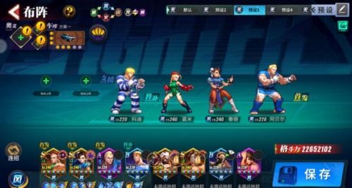 这套阵容可以用科迪的必杀勾人起手,接阿贝尔的连招1生成护盾,然后接春丽的连招2和嘉米的连招3/超连招;也可以先用嘉米的必杀和连招2叠满破甲后强杀对方前排肉盾,可以根据实际战局情况选择。
