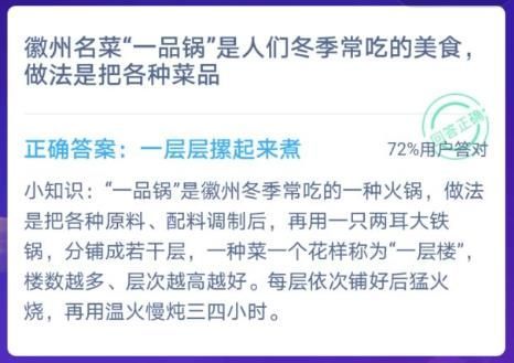 估计不少同学们都不知道徽州名菜一品锅的做法,那这个名菜一品锅到底是怎么制作的呢?正在蚂蚁庄园答题的同学们一定看过来,一起来看看正确答案,了解下名菜的制作方法吧!