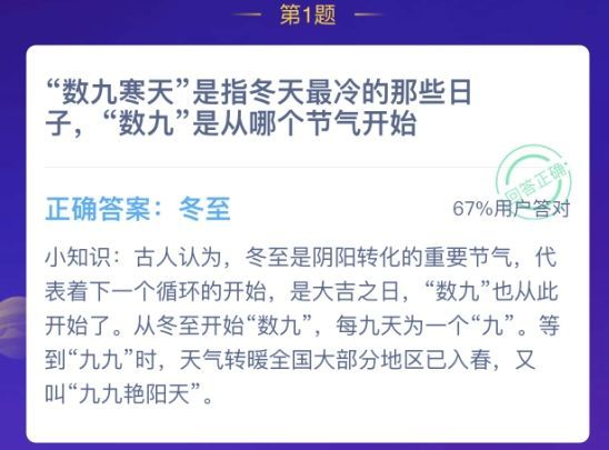 数九寒天中的数九是什么意思?是从冬天的哪一个节气开始?蚂蚁庄园12月21日的这个问题,让对二十四节气不了解的玩家蒙圈了,完全不知道选择什么,经常来庄园小课堂答题的都是一些年轻人,对于二十四节气并不太了解,具体的答案本站小编这就将相关知识分享给大家。