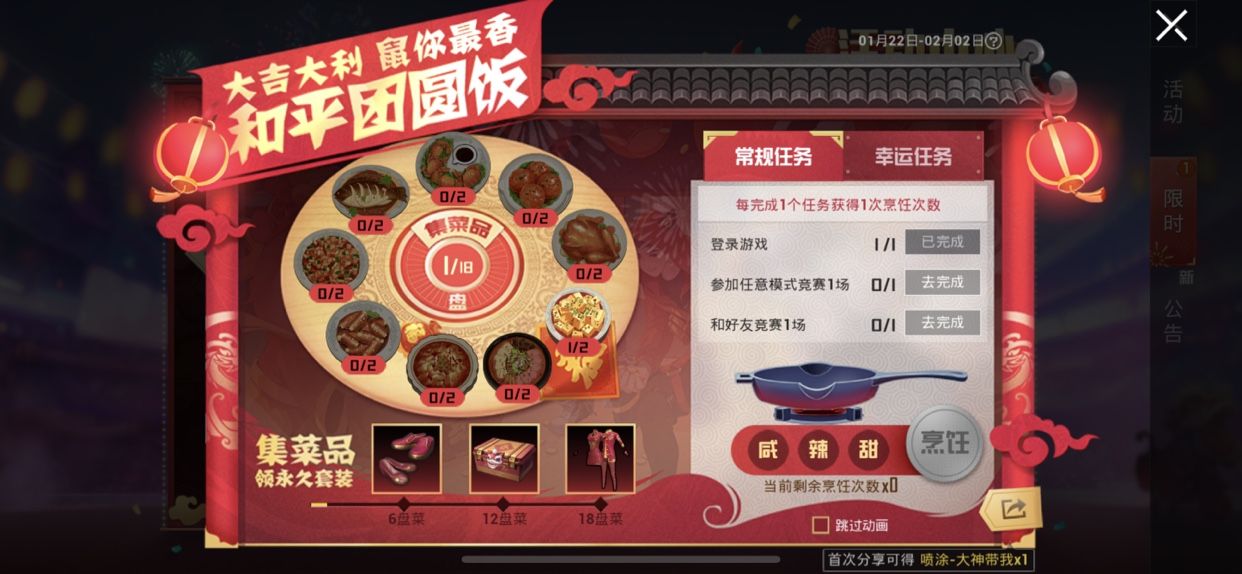 3、通过完成战斗内贴年画、祈愿发财树、单人/组队吃团圆饭1次均可获得1次烹饪次数。幸运任务活动周期内,不进行重置。