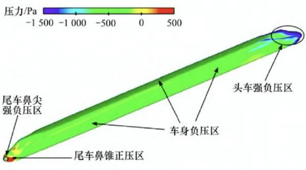 3、这样的设计可以在列车高速前进时让车头单位面积的空气排开量减少,同时减少车尾后方单位面积的空气填充量,让车头附近的气压上升变化率和车尾附近的气压下降变化率不明显,减小压差阻力。