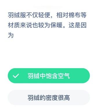 羽绒服不仅轻便,相对棉布等材质来说也较为保暖,这是因为 蚂蚁庄园12月20日答案