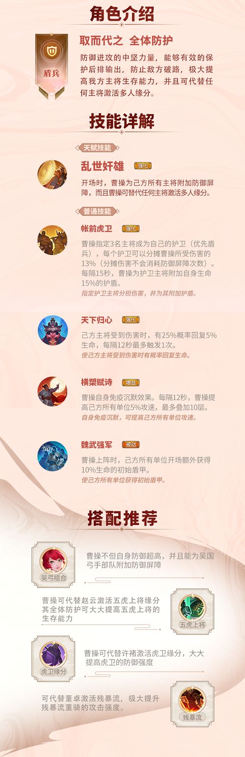曹操可以代替任何角色同时激活多人缘分(例如同时激活五虎上将与虎卫缘分),这使布阵更具灵活性与策略性。