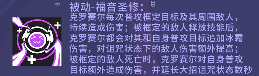 被动:福音圣修每次普通攻击框定目标和周围敌人,持续造成伤害,被框的敌人释放技能,该敌人和克罗赛尔的当前目标将受到一次冰霜伤害,对身上有诅咒debuff的敌人伤害额外提高,在对面有较多同类小怪的情况下,非常容易造成当前目标的斩杀。被框定的敌人死亡时,当前诅咒状态会延长数秒,使得克罗赛尔在面对boss时,也能借助小怪的死亡来大量增伤,可谓兼备AOE和单体输出能力!