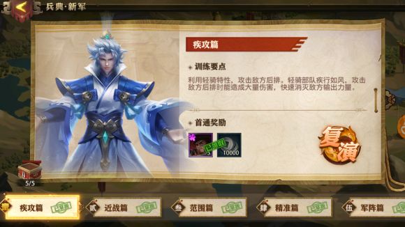新军兵典分为五篇章,分别是:疾攻篇、近战篇、范围篇、精准篇、军阵篇。五个篇章由不同的主将指引,帮助新手在实战中了解对战技巧、熟悉兵种特性。