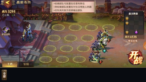 野兽篇要领:把两个能召唤野兽的轻骑一上一下,分别放在距离敌军最远的位置即可。布阵篇和召唤篇都可轻松通过。