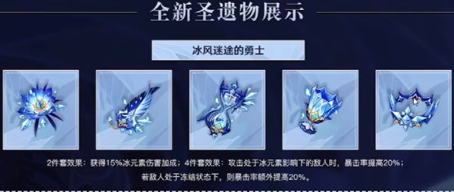 冰套四件套效果:只要是给附上冰元素,就能给20%的暴击,处于冻结状态下还给20%的暴击。只要不打破冰,就给你40%的暴击率,这意味着什么呢?将来只要是能带冰套的,都可以默认暴伤头了,更别说双冰队了,双冰队可以提高15%的暴击率,在你带冰套的双冰打冻结敌人的情况下,你是自带55%的暴击的,这比很多玩家自己堆的暴击还要高,看样子策划是决定好冰队以后就走爆伤流了。