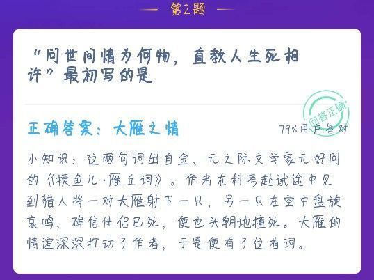 问世间情为何物描写的是?问世间情为何物的意思?蚂蚁庄园今天12.16的题目就是关于这首词,那么平时大家口中的“问世间情为何物,直教人生死相许”是什么意思呢?最初指的是什么?那同学们就跟着小编一起来了解下这句词到底讲的什么东西,一起来看看蚂蚁庄园今天的正确答案是什么!