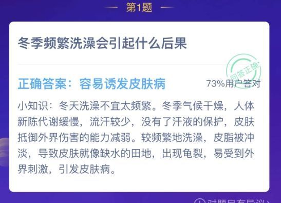 以上就是冬天太频繁洗澡的危害相关知识了,各位同学们现在知道了正确答案了吗。即使是冬天也需要隔个2/3天洗一次澡,天气比较寒冷,没必要天天洗,那些爱干净的同学们一定要忍住哦,不然很容易得皮肤病哦!蚂蚁庄园2020年12月16日答案已经分享完毕,明天同一时间不见不散哦!