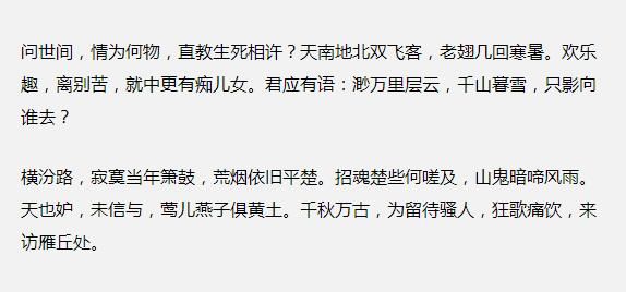 “问世间情为何物,直教人生死相许”这两句并非原文,而是后人在传唱的时候进行了修改。改动之后,上下句皆为七字,格式上对称,让人以为是诗句。同时在下句中增添了“人”字,明确了诗句感叹的主体为人,意思就是“这世间的感情到底是个什么东西啊,让人舍生忘死,海誓山盟。”