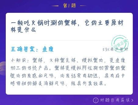 一般吃火锅时涮的蟹棒,它的主要原材料是什么?今天蚂蚁庄园的问题对于吃货来说比较简单,因为都是关于火锅的问题,火锅相信大家都比较喜欢吃吧, 特别是冬天这样天气冷的时候,吃火锅简直不能太爽,但是大家知道我们吃火锅涮的蟹棒,它的主要材料是什么吗?小编刚开始以为是蟹黄和一些其他原料做成的,看了答案之后才晓得,原来蟹棒压根就和螃蟹没有一点关系,想要知道正确答案和解析的小伙伴接着往下看看呗!