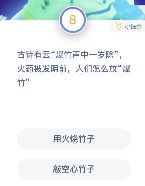 蚂蚁庄园火药发明前人们用什么放爆竹?放爆竹是过年过节经常会用到的,那么在古代的时候,也就是火药没有发明之前大家是用什么放爆竹的?这个问题让很多人都不知道怎么回答,今天就和本站小编一起来讨论吧。