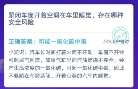 蚂蚁庄园紧闭车窗开着空调在车里睡觉存在哪种安全风险?冬天大家总是喜欢在车里面休息,还喜欢开着空调,那么在这种情况下紧闭车窗是不是正确的做法呢?这就是庄园小课堂12月12日的问题答案,我们一起来看看吧。