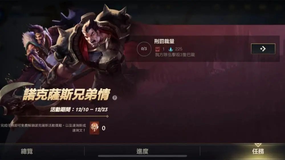 伴随着努克萨斯两兄弟的上线,手游也开启了「诺克萨斯兄弟情」的活动,完成任务可以免费获得英雄、精粹、表情的奖励,诺手获德莱文都有可能获得,需要注意的是,这个活动是限时的,只持续到12月23日就会结束。