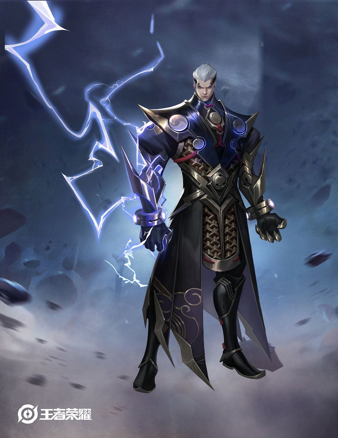 【形象设计思路】发型选择了刚直的短发,突出他的雷厉风行。服装的设计上借鉴了大唐明光铠的切分形式——方形外轮廓,圆形装饰;同时使用了山文甲片的元素,突出唐朝盔甲的特色。同时加入了雷和云样式的暗纹,与司空震所掌控的雷电之力相匹配。