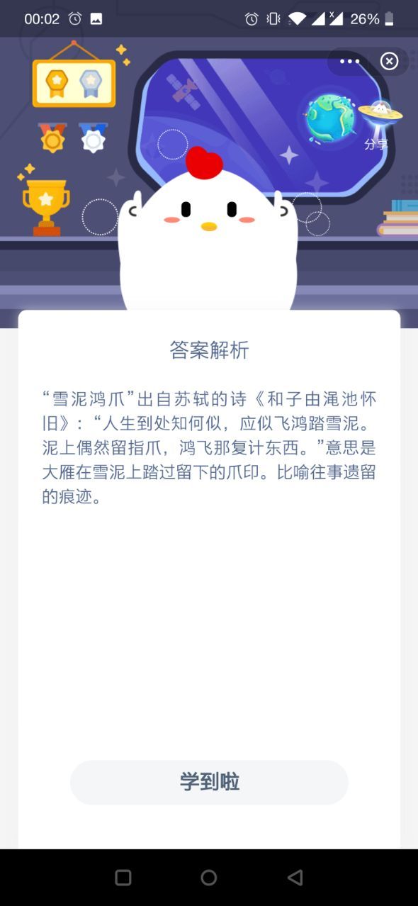 这下大家应该知道成语雪泥鸿爪的意思了吧!该成语出自苏轼的诗句,大家赶紧回答问题,领取小鸡饲料吧,能够帮到大家真的很开心!