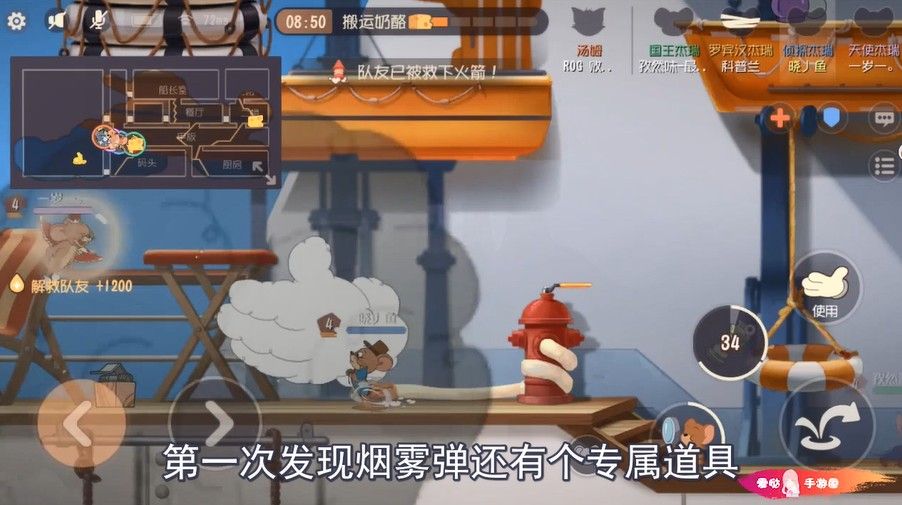 队友被捉,第一次发现侦探还有个专属道具,那就是烟雾瓶,玩过侦探的应该知道,自带烟雾弹技能,所以烟雾对侦探还算友好,烟雾瓶导致的视野缺陷,烟雾弹可以解隐身也可以解,加上两个技能冷却时间都不长,烟雾的话还是很好用的,最主要的一点儿就还是,烟雾状态里面看不到小地图,猫的视野貌似比老鼠还要大一些,但是“失明”状态下,小地图都是看不到了,而且范围也是比较小,持续时间也不短,所以假如玩侦探碰到汤姆怎么办?拿着烟雾瓶“同归于尽”了。