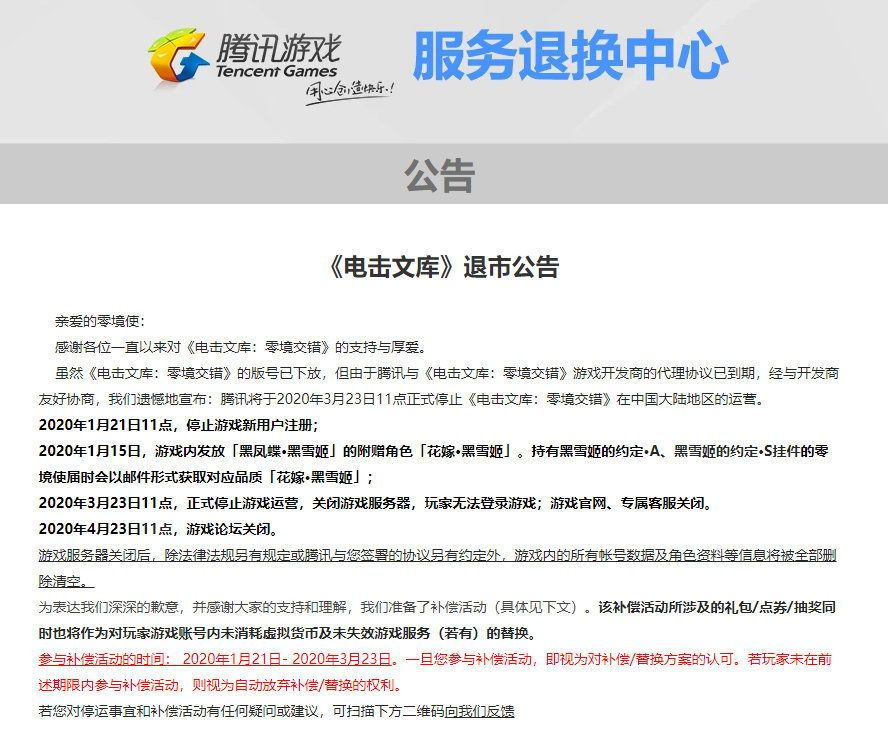 感谢各位一直以来对《电击文库:零境交错》的支持与厚爱。虽然《电击文库:零境交错》的版号已下放,但由于腾讯与《电击文库:零境交错》游戏开发商的代理协议已到期,经与开发商友好协商,我们遗憾地宣布:腾讯将于2020年3月23日11点正式停止《电击文库:零境交错》在中国大陆地区的运营。
