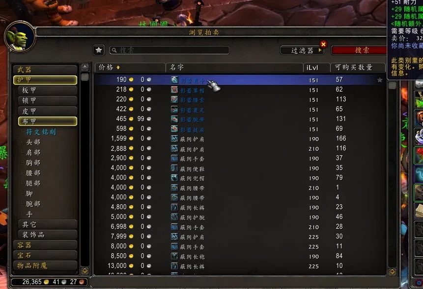来到AH,找到自己对应的护甲,然后过滤器里选择显示对我有提升的,就可以看到有一套151装等的蓝装,卖价非常便宜,非常适合提升装等。